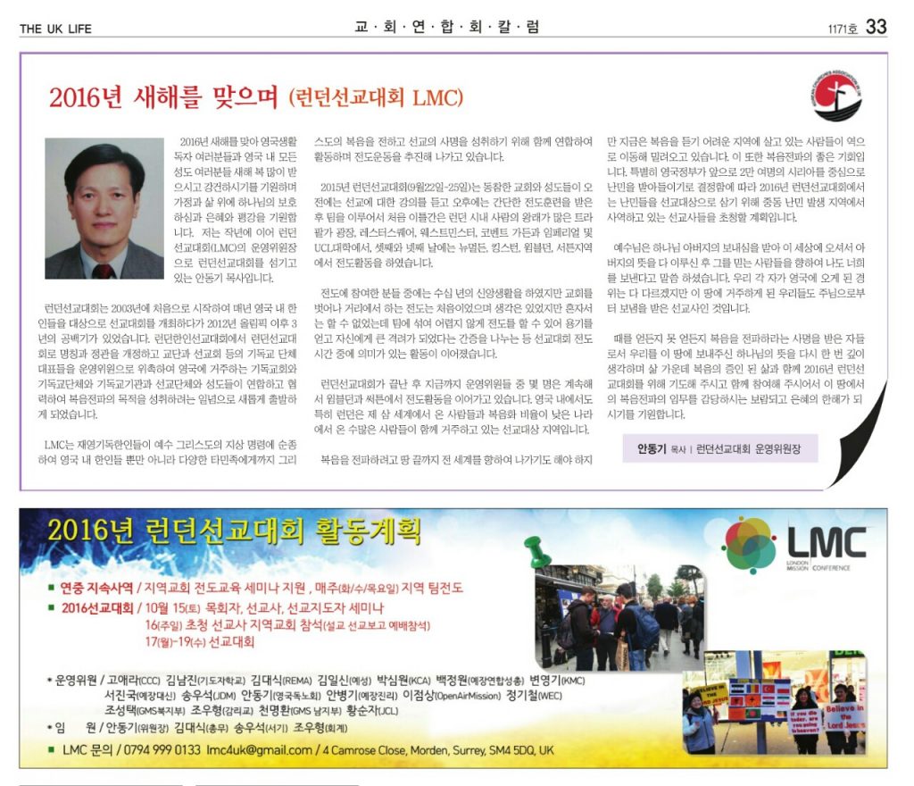 2016년 새해를 맞으며 -런던선교대회 위원장 안동기 목사-