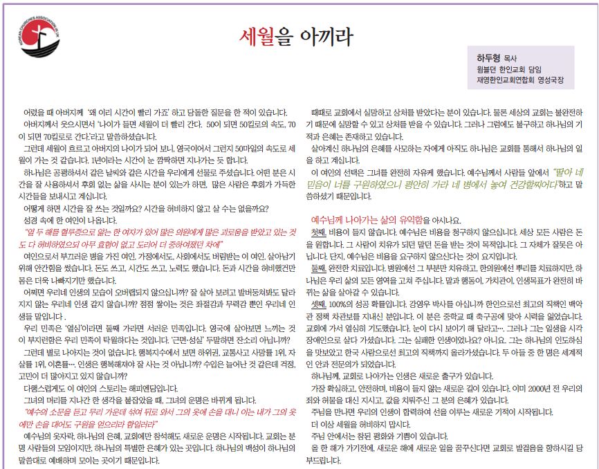 세월을 아끼라 – (윔블던 한인교회 담임 하두형 목사)