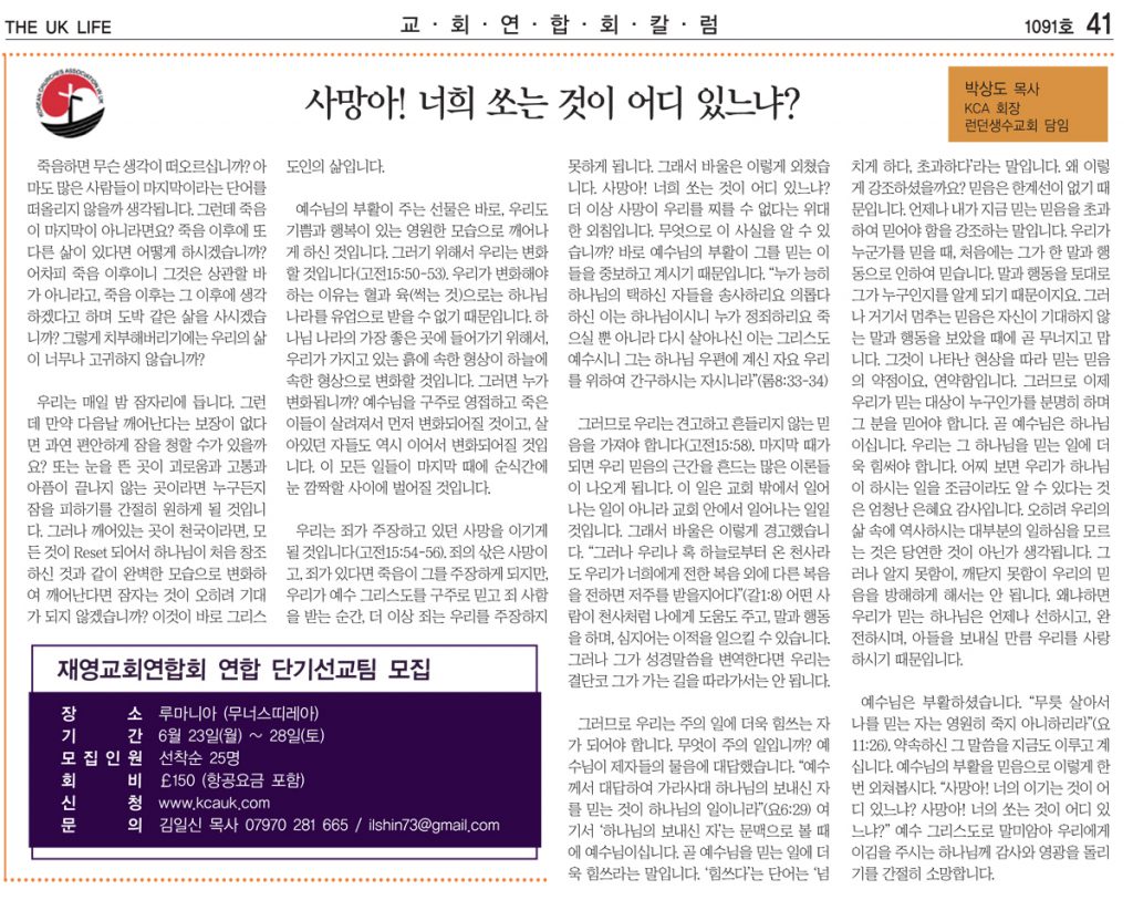 사망아 너희 쏘는 것이 어디 있느냐? – 박상도 목사 (KCA 회장)