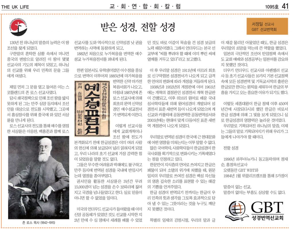 받은 성경, 전할 성경 – 서정일 선교사 (GBT 성경번역선교회)
