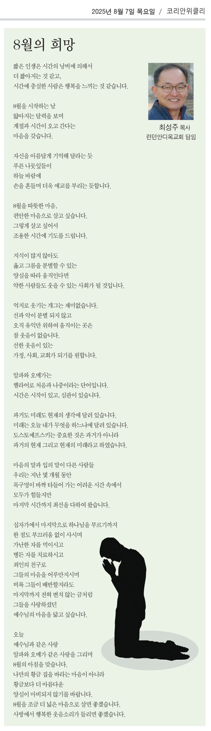 연재기사 8월의 희망 – 최성주 목사 PrevPrevious배터시 파워 스테이션(Battersea Power Station) – 김석천 목사 Next차트웰 Chartwell (윈스턴 처칠 기념관)을 다녀와서 – 심상훈 목사Next